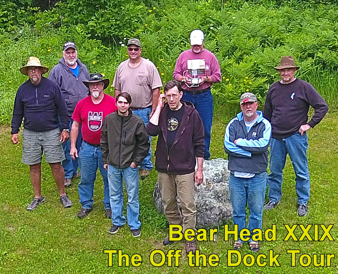 Who needs boats? Many fish caught right off the dock. New tents successfully demonstrated during a triple thunderstorm day. Notice the airborne photo platform - high tech drones invade Bear Head.